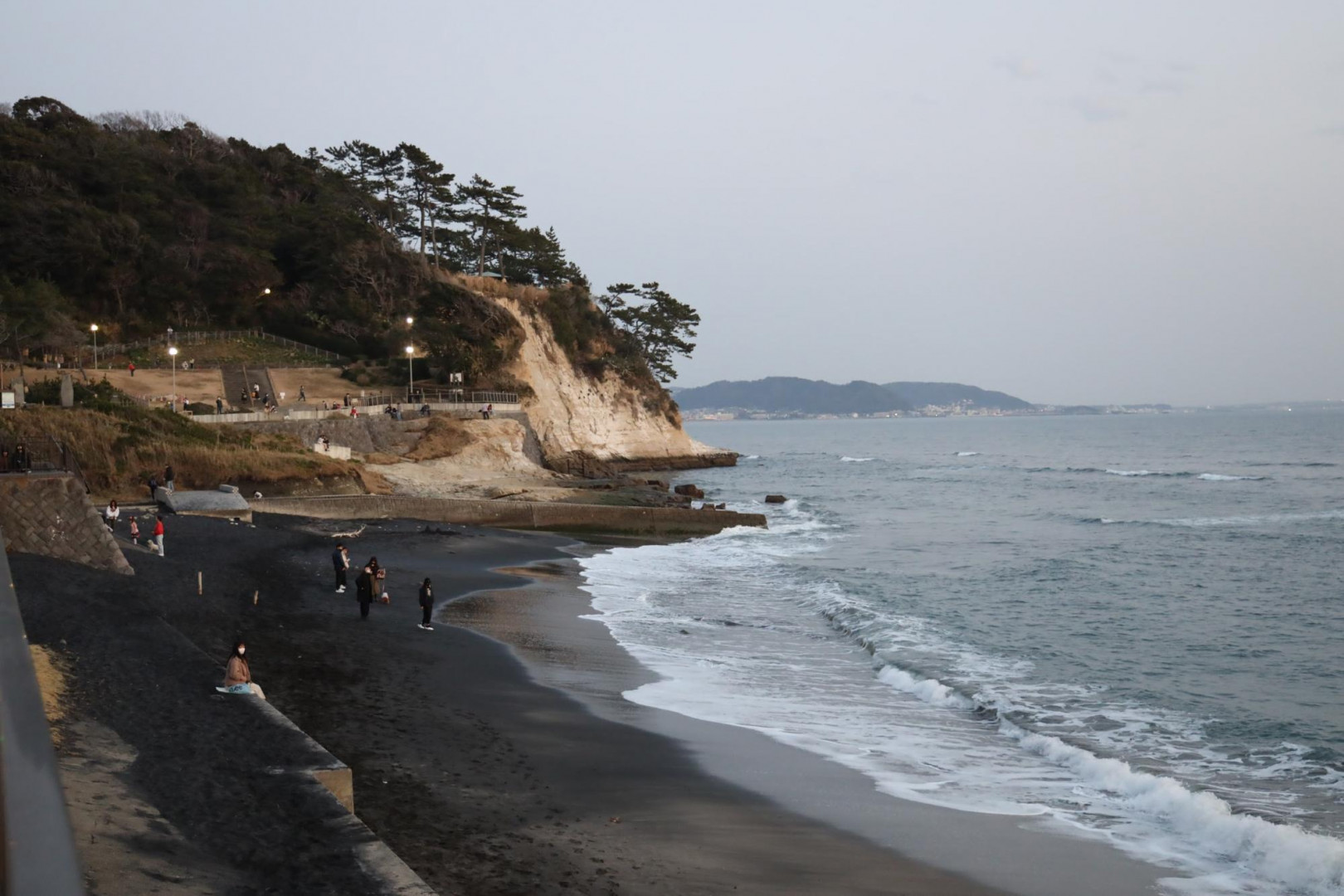 From Inamuragasaki Station, head south towards the ocean and cross the highway so you can walk along the seaside route. Our goal is Cape Inamuragasaki a few minutes walk to the east. Along the way, we will see Kamakura Yuigahama Beach, a famous beach in Japan for swimming and surfing.