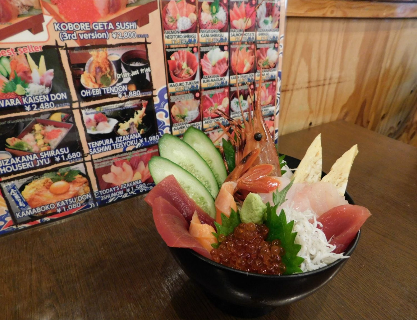 This is their original kaisendon dish, the Odawara Kaisendon (2678 yen with tax), which features maguro tuna, salmon, ikura (fish roe), shirasu (whitebait), omelette and other local fishes, as well as a whole large shrimp on a bed of steamed rice. The fresh wasabi and sushi rice, as well as the other toppings, make this dish taste even better - the sheer variation available just in this one bowl is sure to make you feel like you've had an entire seafood course!