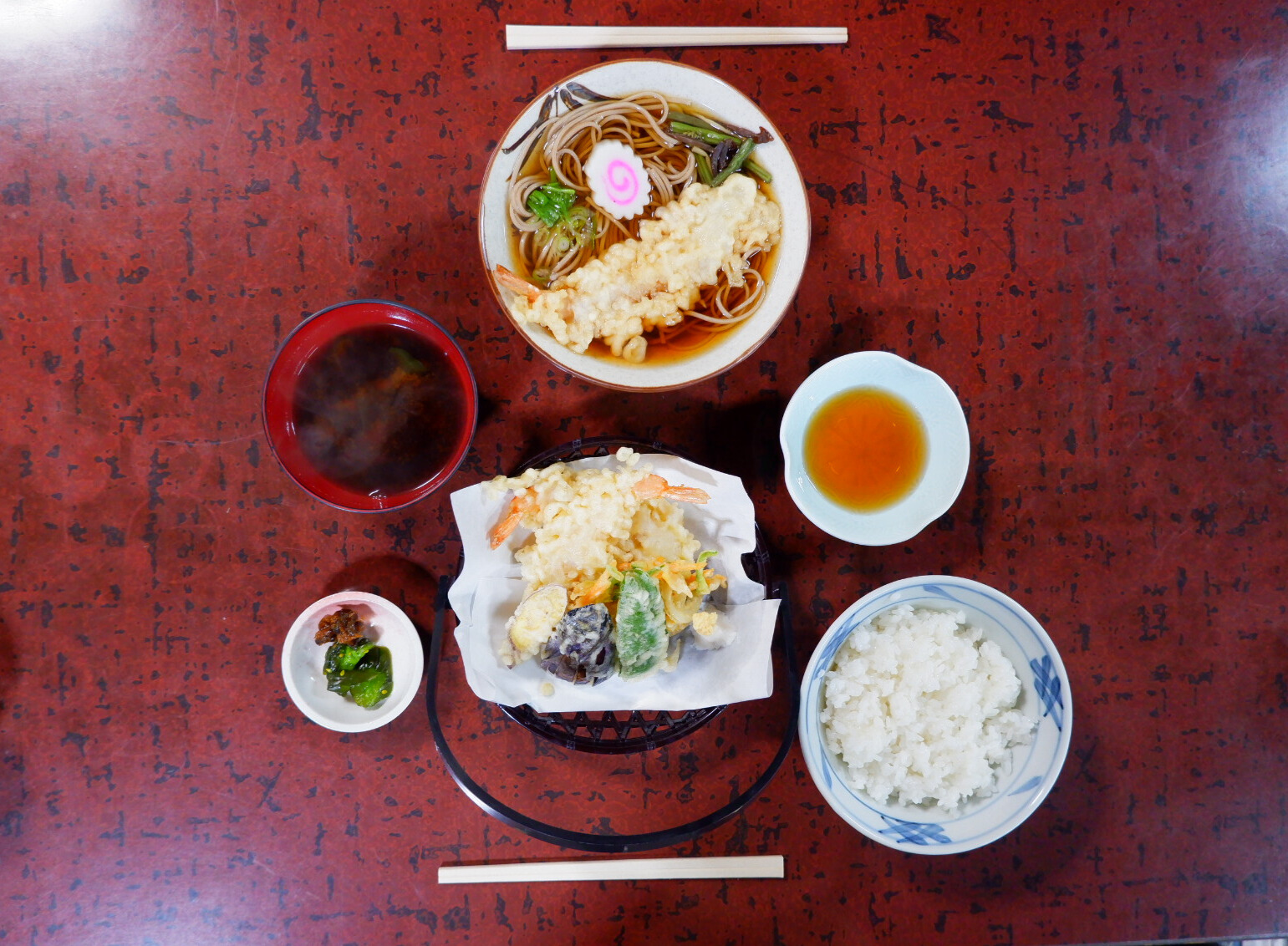 菜单包含多款令人满足的面食,包括荞麦/乌冬面、狸猫(炸面衣)荞麦面、月见乌冬面、山菜荞麦/乌冬面,以及广受欢迎的天妇罗荞麦/乌冬面。饭类则有咖喱饭、天丼(天妇罗盖饭)与大麦饭配山药泥定食,这道当地特色料理既饱腹又温和,深受徒步游客喜爱。