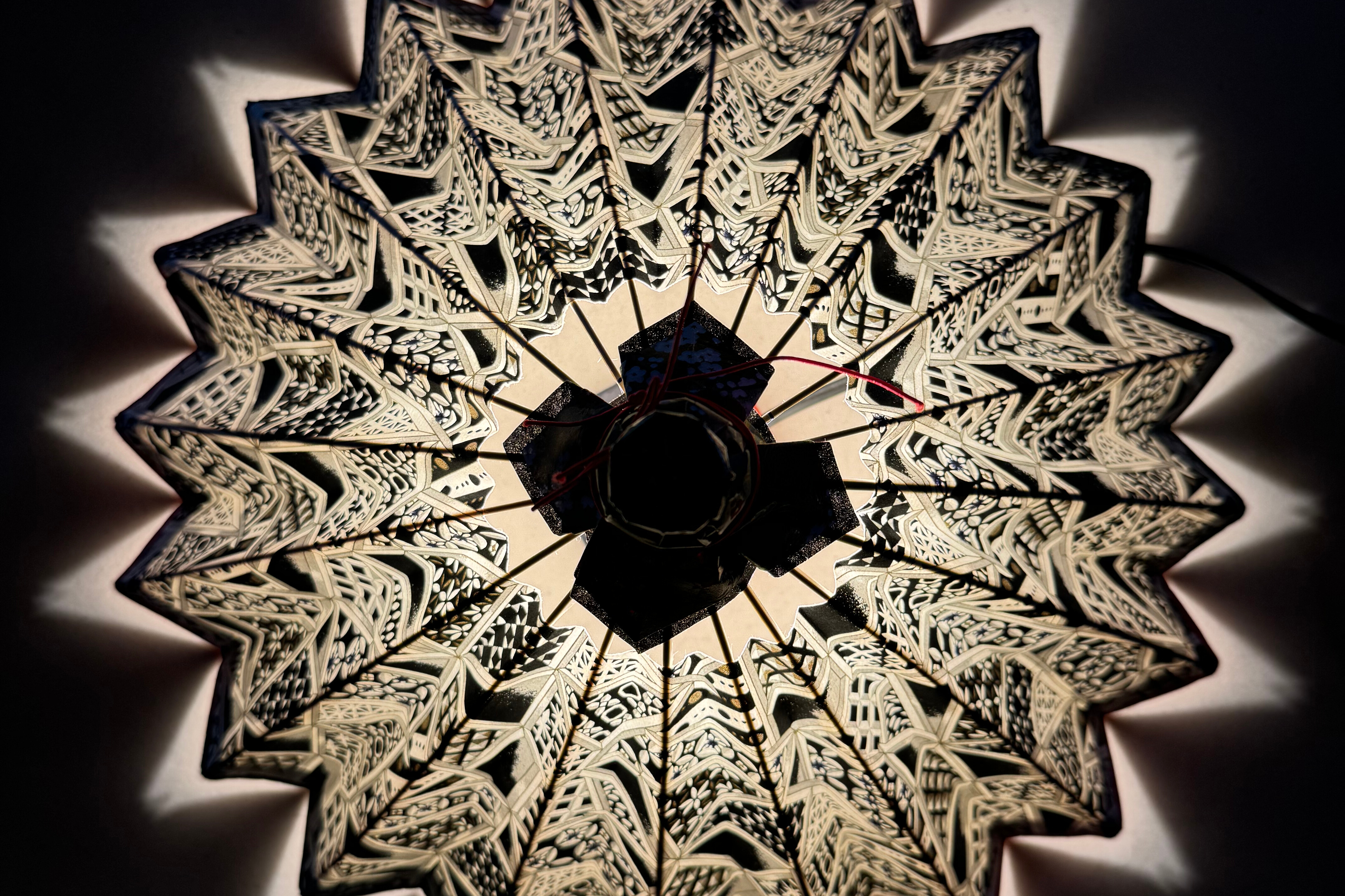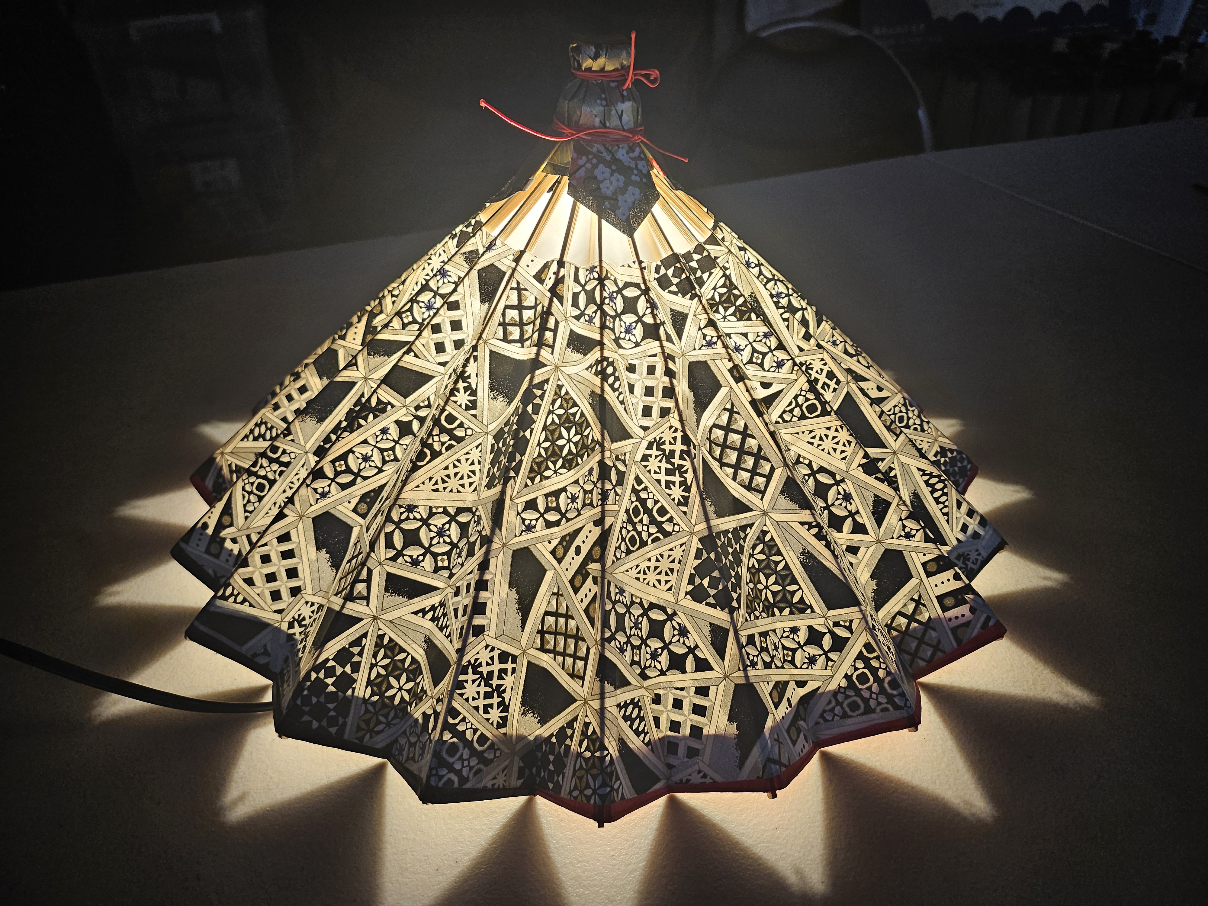 全部完成了吗?当您把最初选的和纸图案粘贴到骨架上时,灯罩就真正成形了。图案对齐并牢固粘好后,就该休息一下,让它自然晾干。