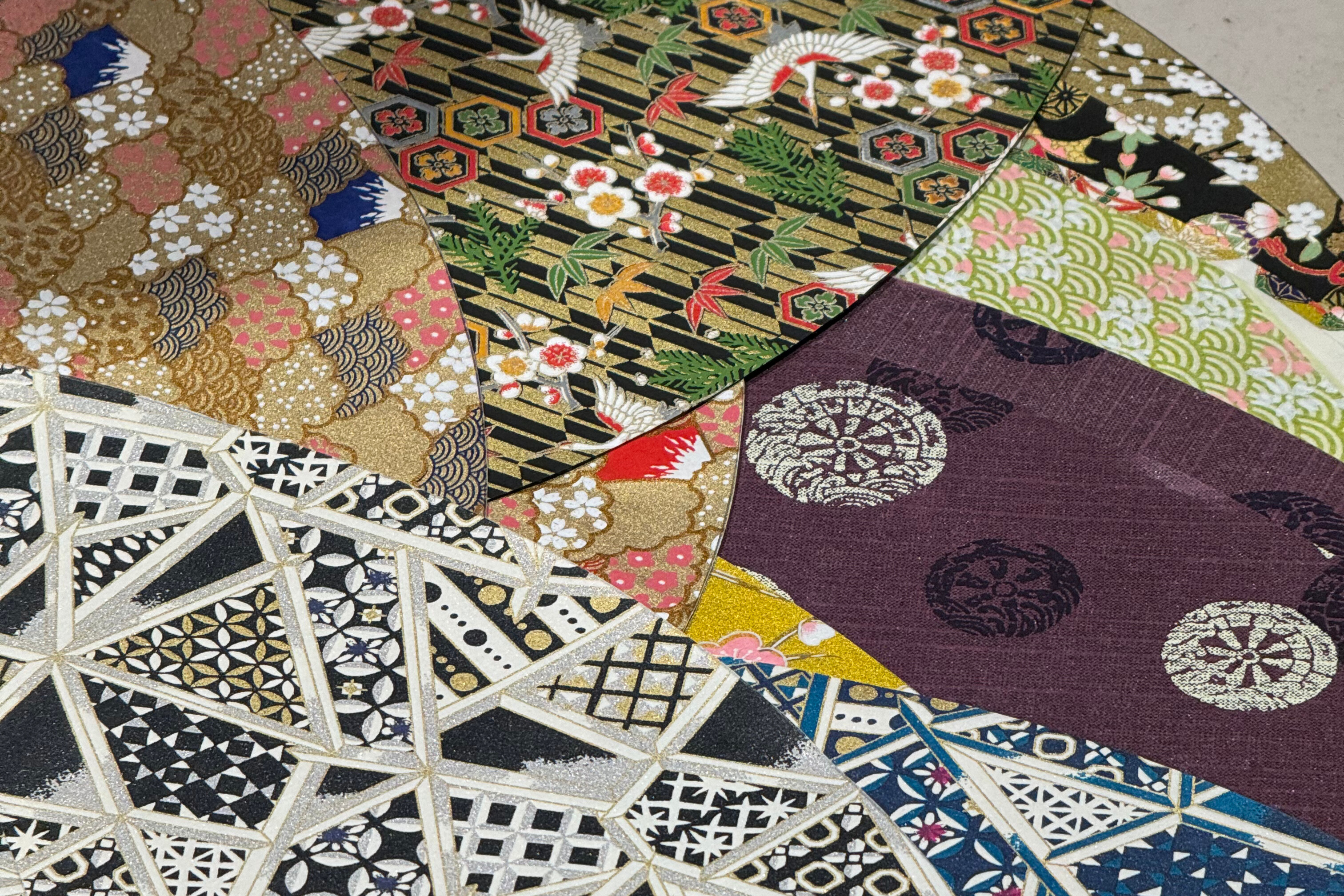 为灯罩顶部覆盖轱辘的小片材料——称为“kappa”——选择两款和纸图案。这些材料将被折成特定的图案,就像折纸一样。