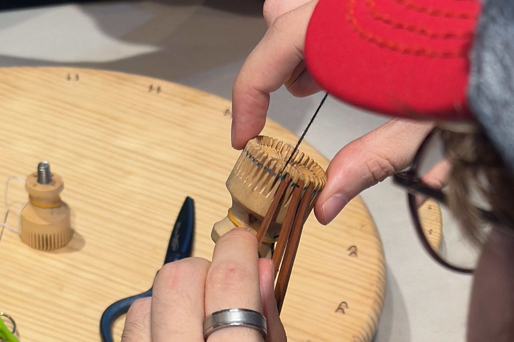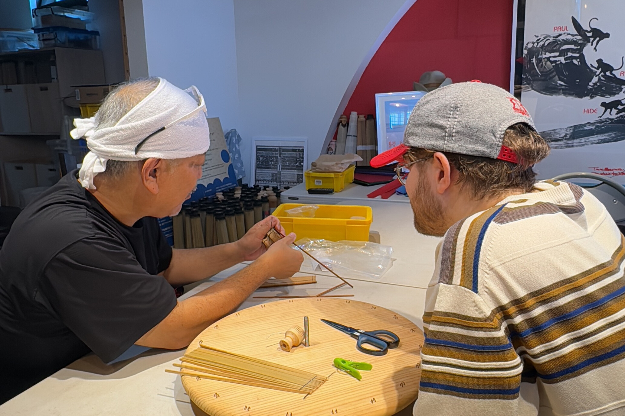 接下来,您将学习如何将灯罩的“骨架”——称为小骨(kobu)——穿入轱辘(rokuro)中。这需要用到针线,以及高度的专注、坚定的意志和稳健的手法。随着时间的推移,您会逐渐体会到江户时代工匠那种缓慢而专注的生活节奏。