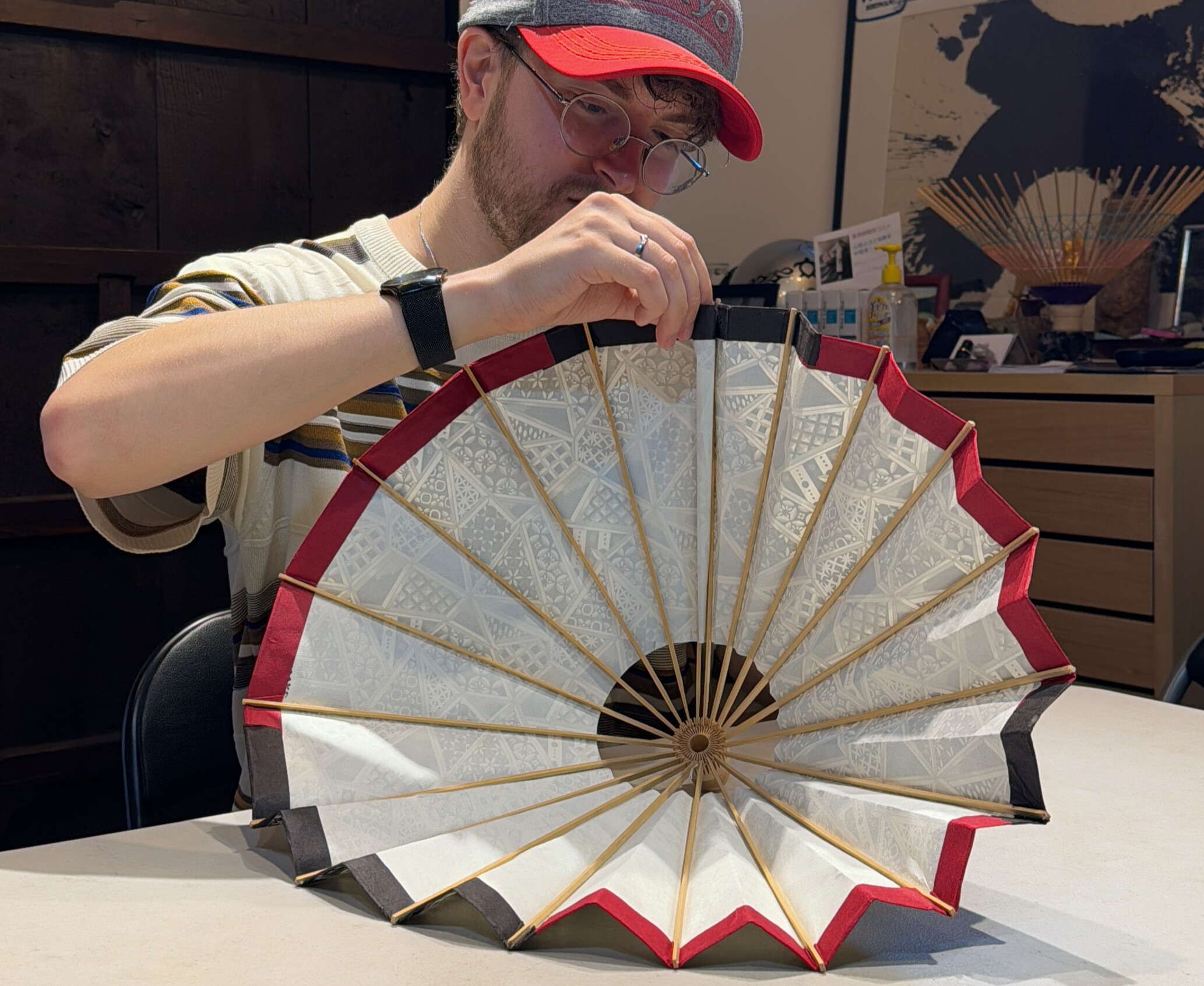 完成这部分后,您将面临另一个选择……您想让灯罩的边缘呈现什么颜色?在挑选颜色时,可以考虑与之前选择的和纸图案形成对比,或者选择相近的色调营造统一感,让您的个性得以展现。决定好颜色后,需要将它们裁剪到合适的尺寸,然后将和纸折叠包裹在绳索上并用胶水粘合,制作出边缘。这同样需要时间和耐心,如果您觉得自己或灯罩快要“散架”,杉崎先生会在旁边支援。