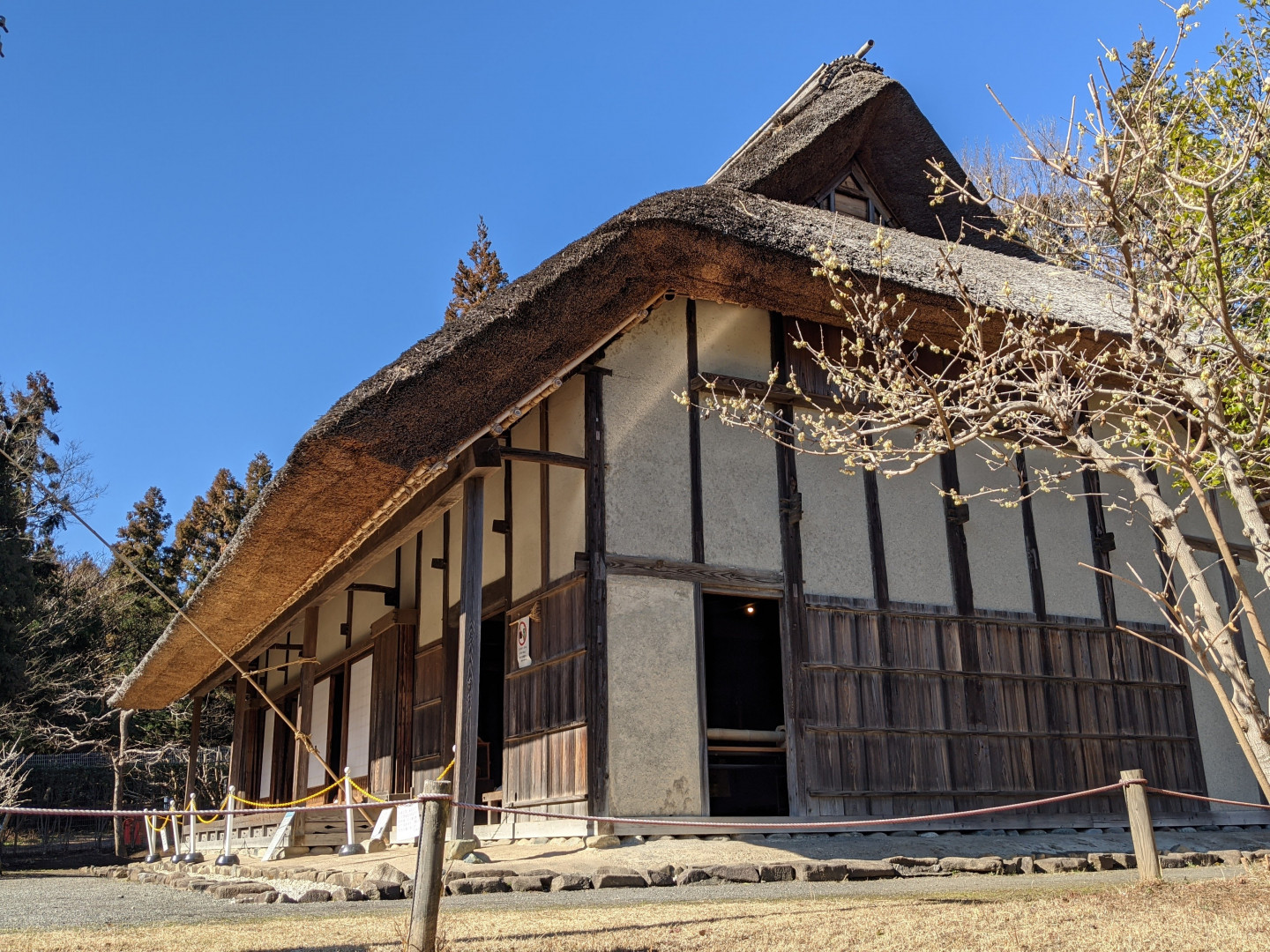 到了泉之森的西南角,传统的民家风格的日本民居就会悄悄进入视野。可以近距离地参观这些雄伟而又充满乡土气息的农舍,还可以详细地了解(日语)从odoguchi正门到中央座敷区的不同部分,以及当时使用的工具(炉灶锅)。