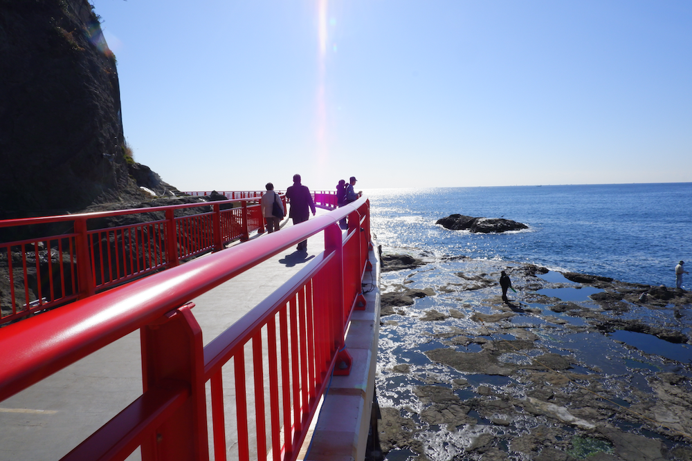 從岩洞出來,您可能會看到人們在海岸邊釣魚、散步。如果您下去在島的側面繞一圈,您就有機會跳上一條船,把您帶回島入口處的橋。如果您不喜歡走得更遠,這不僅是一種更快的返回方式,還可以讓你從不同的角度欣賞江之島的美景。